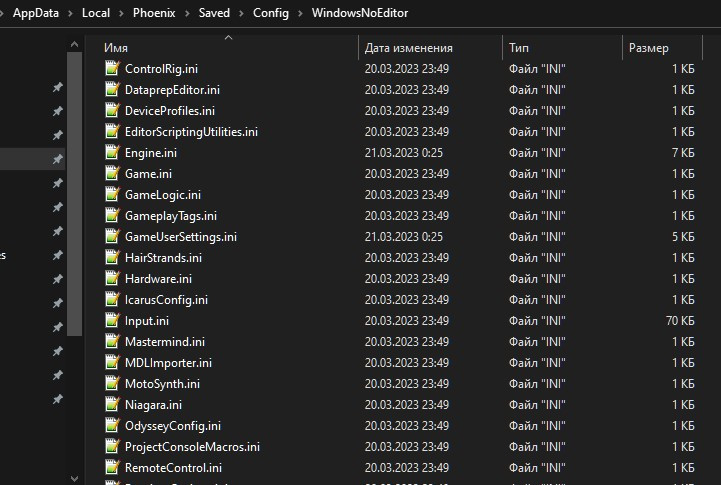 Ок,галочка только чтение убрана,при запуске вылетает сразу,в пути C:\Users\Windows 10\AppData\Local\Phoenix\Saved\Config\WindowsNoEditor только файл Engine.ini