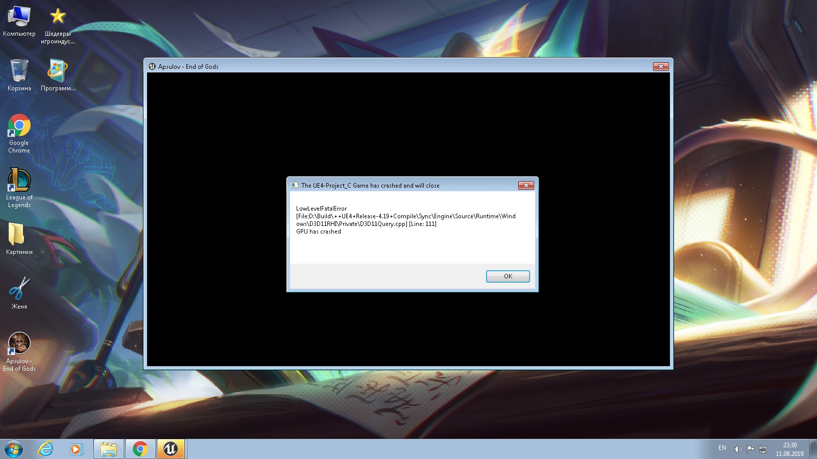 Не знаю,показывается ли скрин на сайте или нет,но у меня он на весь экран почему-то.Ошибка такая: The UE4-Project_C Game has crashed and will close