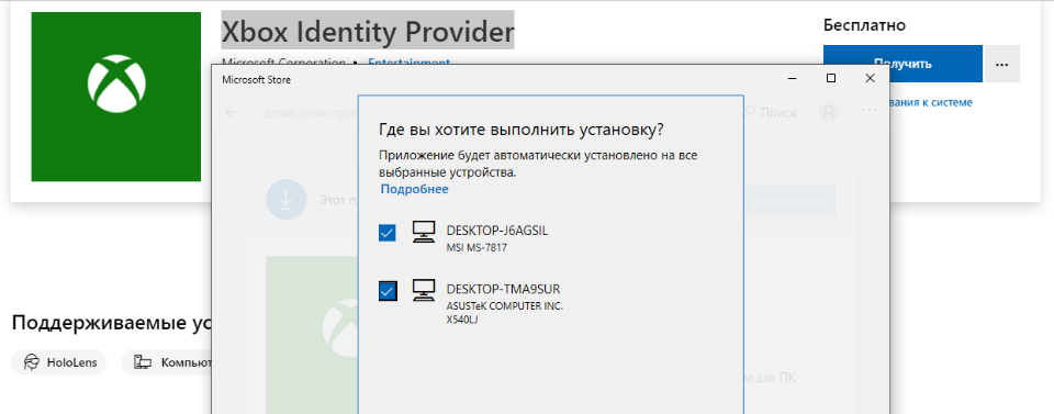 ЗЫ Я думаю дело в Xbox Identity Provider,пишет что стоит,но когда я нажимаю установить это приложение на моих устройствах,там показывается имя моего компа!И пишет идет попытка установления на выбранные устройства.Как исправить?