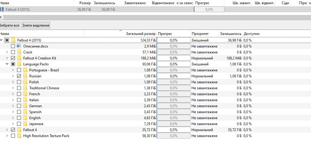 При скачивании террента у меня качает папку с игрой - Fallout 4 (объемом 109 мб). Папку таблетки (объемом 162 мб), а также папку с языковым архивом (объемом 4,63 гб - только английская версия отмеченная для закачки).
